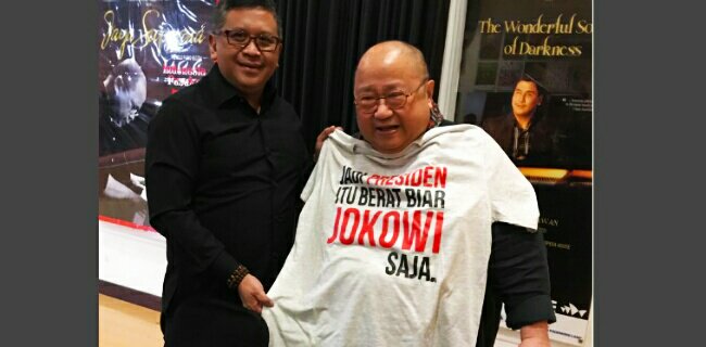 Koordinator Forum Rakyat, Lieus Sungkharisma kaget ketika melihat kaus bertuliskan Jadi Presiden Itu Berat Biar Jokowi Saja yang diserahkan Sekjen PDIP, Hasto Kristiyanto kepada budayawan Jaya Suprana.
